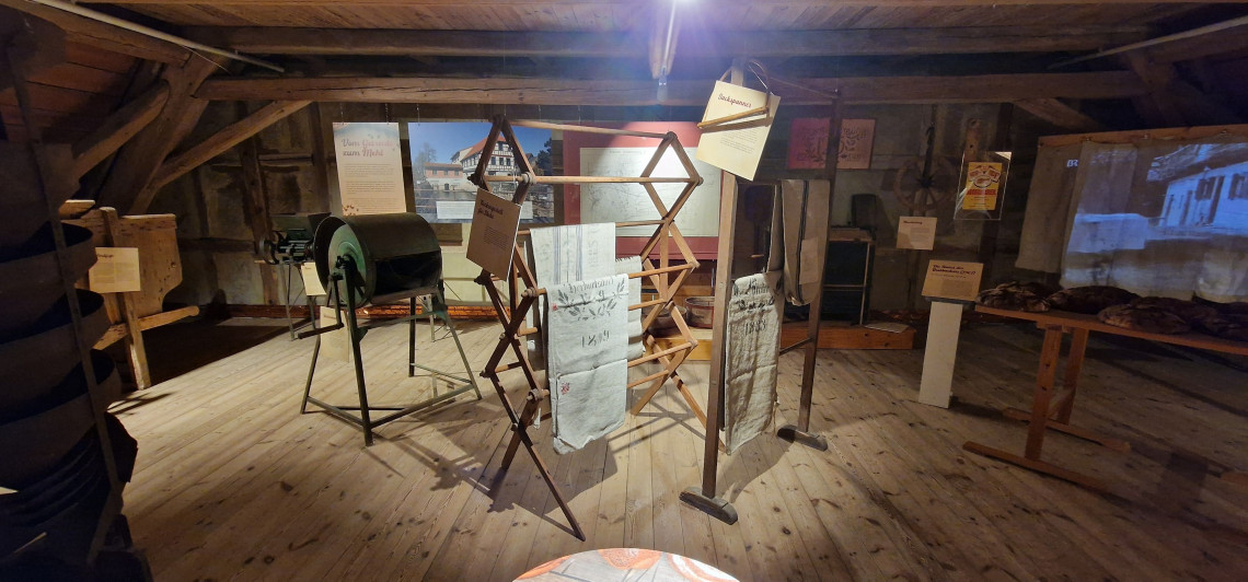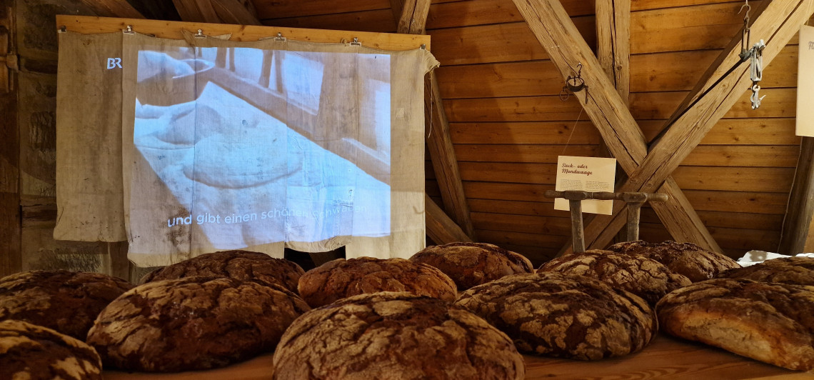 Neben informativen Texttafeln werden Videos gezeigt, stilecht auf alte Mehlsäcke projiziert, um die Geschichte hinter den Objekten lebendig werden zu lassen.