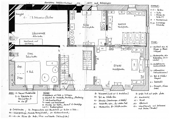 In der Stube standen die Betten des Schäfers und seiner Frau (getrennte Einzelbetten). Es gab einen großen Tisch und ein Kanapee aus schwarzem Leder. An einem Sekretär wurden Schreibangelegenheiten erledigt, Näharbeiten an einer Nähmaschine. Wärme spendete eine großer Kachelofen, der von der Küche aus beheizt wurde. Auf einer Wandkonsole direkt neben der Tür, und damit immer griffbereit, lagerten Arznei für Vieh sowie diverse Hütestecken. In der Kammer nebenan standen zuletzt fünf Betten. Oft schliefen darin jedoch mehr als fünf Hausbewohner. Die Küche war bis zur Restaurierung des Hauses in den 1970er Jahren eine Rauchküche. Hier wurde also auf einem offenen Feuer gekocht, im Rauchfang darüber wurden Schinken und Würste geräuchert. Vom Flur des Hauses führte eine Sandsteintreppe in den großen Vorratskeller, der auch im Sommer ein konstant kühle Temperatur hält. Vom Flur aus gelangte man außerdem in die Säukammer mit den Schweinefächern. Hier standen auch noch der Hasenstall und eine Hobelbank mit Werkzeug. Im Raum nebenan waren eine Kuh und Ziegen untergebracht.