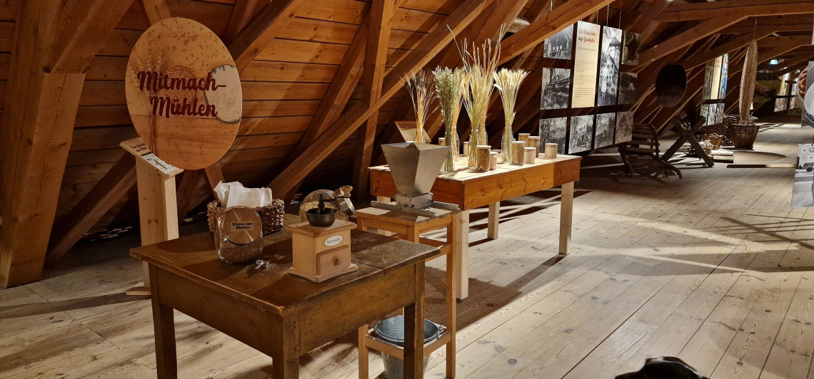 Neben informativen Texttafeln werden Videos gezeigt, stilecht auf alte Mehlsäcke projiziert, um die Geschichte hinter den Objekten lebendig werden zu lassen.
