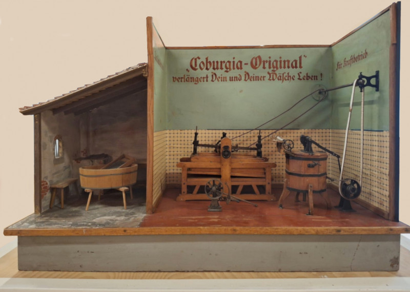 Waschküchenmodell von ca. 1900 von der „ersten thüringischen Waschmaschinenfabrik“ Otto Hörhold aus Neuses. Zwei Waschrealitäten sind hier gegenübergestellt: Auf der einen Seite Wäschewanne und Waschrumpel, auf der anderen Seite die optimale, moderne Form mit motorbetriebener Hörhold-Waschmaschine und Wäschemangel.